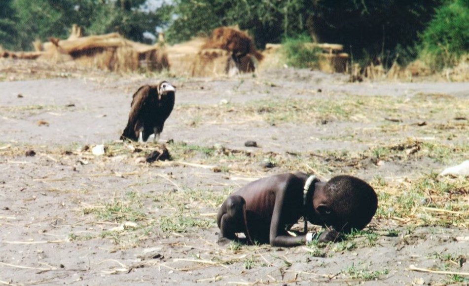La photo a été prise pendant une famine dévastatrice qui a frappé le Soudan du Sud. Kevin Carter, en mission pour le New York Times, documentait la crise humanitaire. Le cliché est d'une puissance brute : il ne montre ni violence directe, ni effusion de sang, mais une scène d'une cruauté silencieuse. L'enfant, visiblement au bord de l'épuisement, et le vautour, symbole de mort et de charognard, créent une composition glaçante. La désolation du paysage accentue le sentiment de solitude et de désespoir.